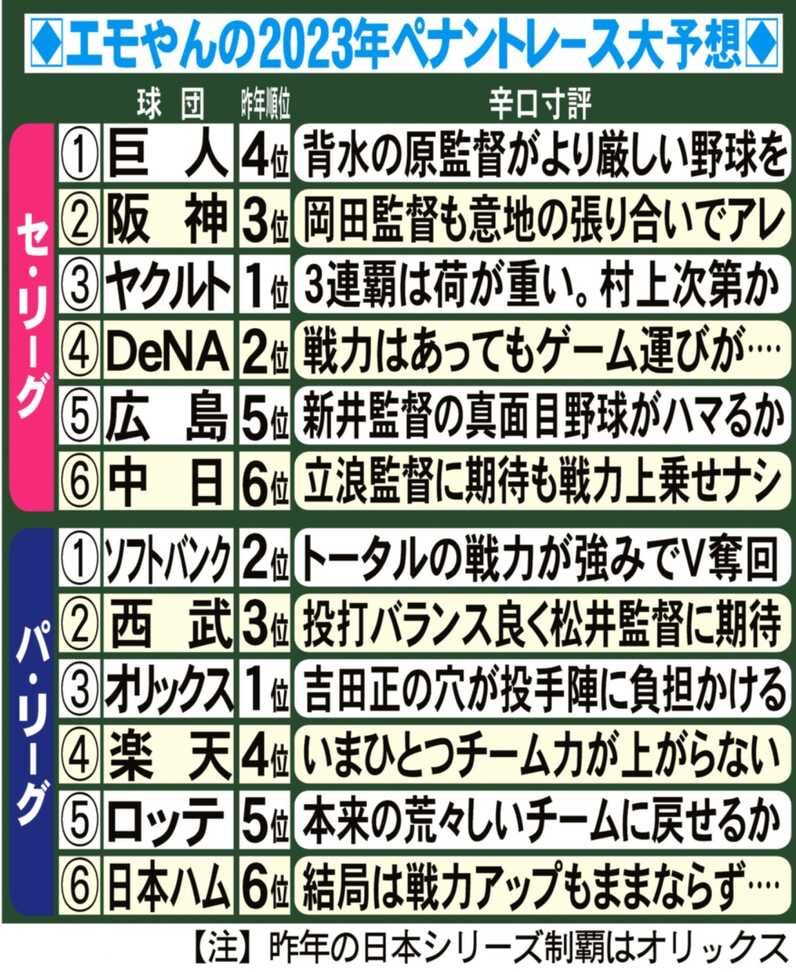 【なるべく週刊エモト】日本一早い順位予想 セは巨人、パはソフトバンク ’23は両リーグとも強豪復権!