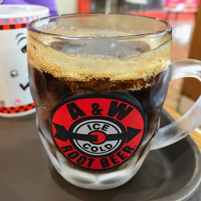 なぜなんだ、ルートビア!これ人気?ともかく、コーラ的な物はこれしかないんだ、A&Wでは♡