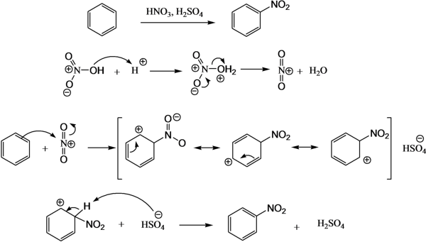 1)ベンゼンのニトロ化の反応機構を書け