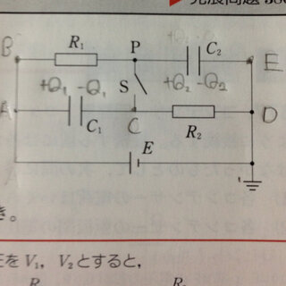 Yahoo!知恵袋高校物理 コンデンサーを含む回路について質問です。図のように、電気容量C1,C2のコンデンサー、抵抗値R1,R2の抵抗、内部抵抗の無視できる起電力Eの電池及びスイッチSを接続する。スイッチSを閉じて
