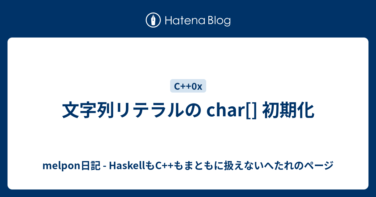 ![melpon日記 - HaskellもC++もまともに扱えないへたれのページ 文字列リテラルの char[] 初期化](https://ogimage.blog.st-hatena.com/17680117127145456302/17680117127145474121/1558222478)