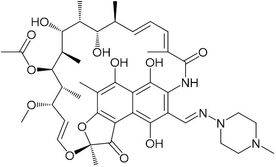 rifampicin (rifampin, rifamycin class) tuberculosis antibiotic molecule. Skeletal formula.