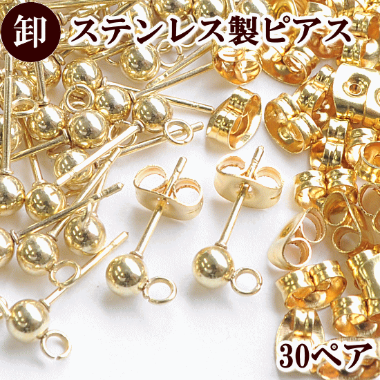 【卸売り】 ステンレス製 カン付き ボール スタッド ピアス ゴールド 30ペア 60個 ■ まとめ買い SUS304 SUS316 K14GP 14Kメッキ 金具 アクセサリー 業務用 プロ用…