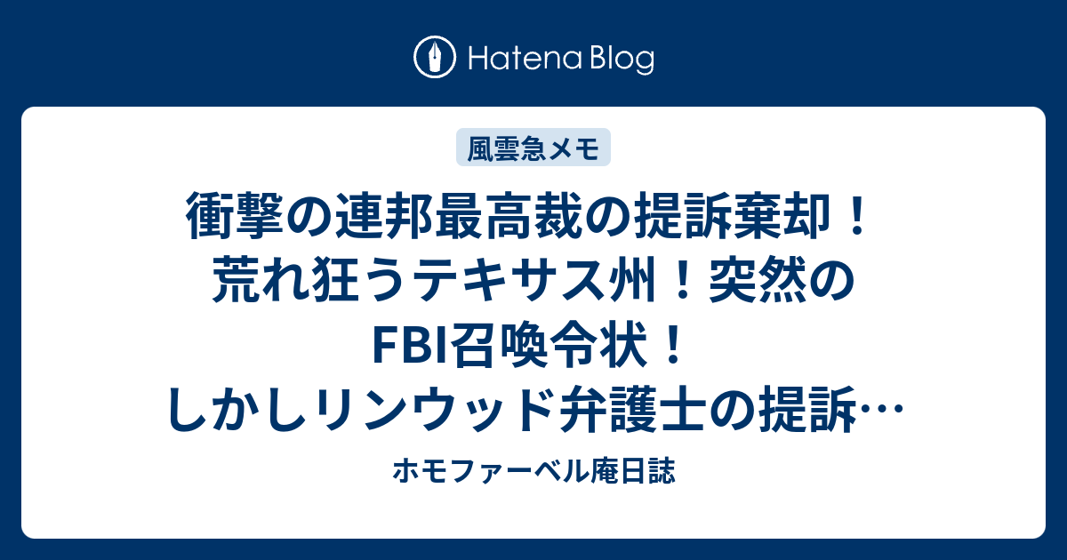 ホモファーベル庵日誌 衝撃の連邦最高裁の提訴棄却!荒れ狂うテキサス州!突然のFBI召喚令状!しかしリンウッド弁護士の提訴は受理の見込み