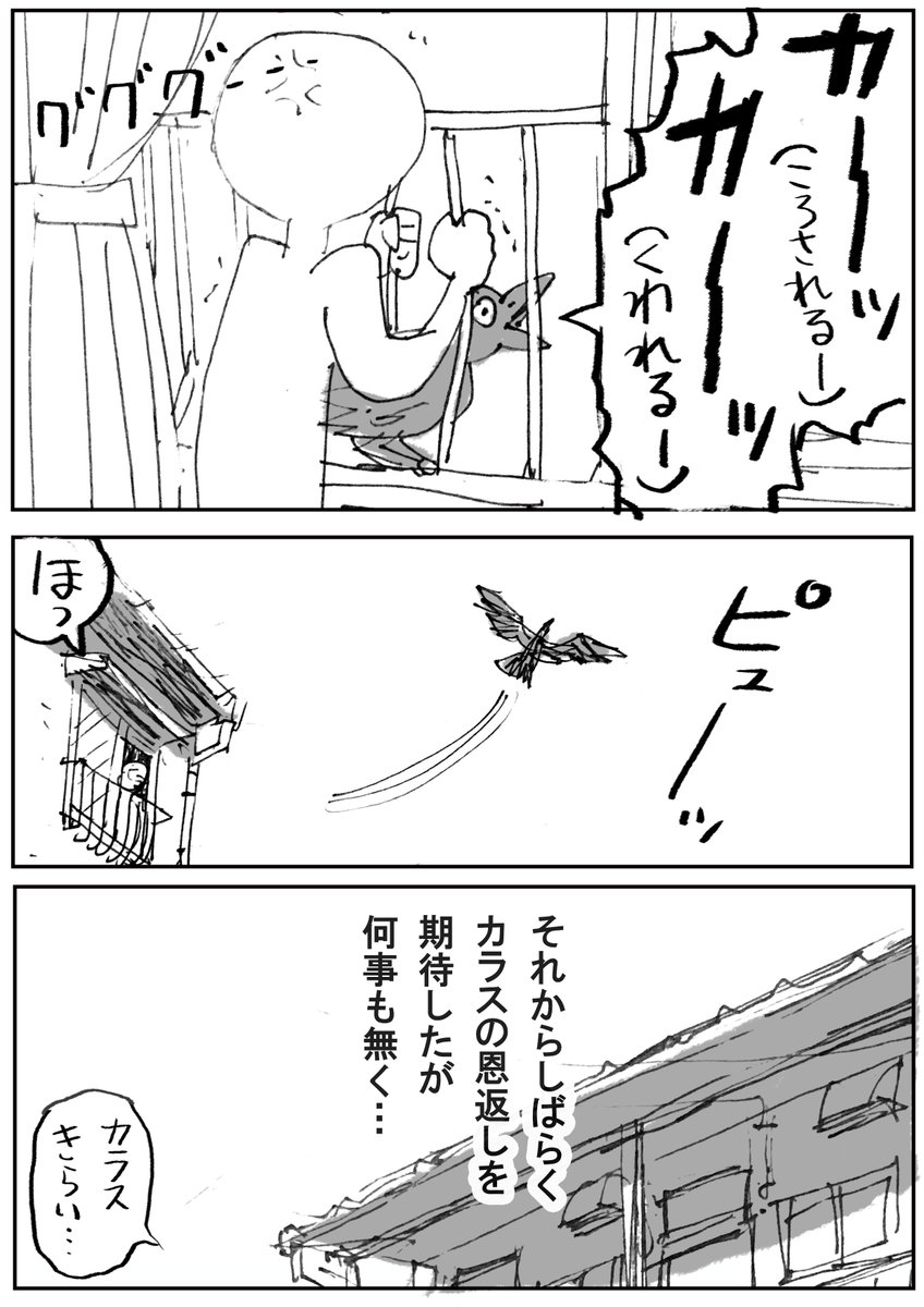 大きなカラスの声で目覚めるとそこには囚われの身となったカラス、そして上空を見上げると…!「怖い映画思い出しちゃう」