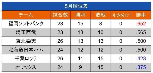 現在JavaScriptが無効です。シーズン開幕から1カ月……昨年の今頃は? 2022年の月別勝率を振り返る3~4月:東北楽天が驚異的な勝率をマーク5月:7連勝を飾り好調な福岡ソフトバンク。ペナント覇者のオリックスは苦戦6月:投打の主軸が躍動した千葉ロッテがトップ7月:オリックスが6割超えの勝率で初の月間勝率1位に8月:福岡ソフトバンクが2度目のトップ。3連続で2位の埼玉西武も同率1位9〜10月:投手陣の奮闘が光ったオリックスが制覇。北海道日本ハムは初の勝ち越しで有終の美を飾る関連リンク著者プロフィール パ・リーグインサイト 関連リンク新着記事おすすめ記事(Doスポーツ)新着コラム 日本オリンピック委員会公式サイト