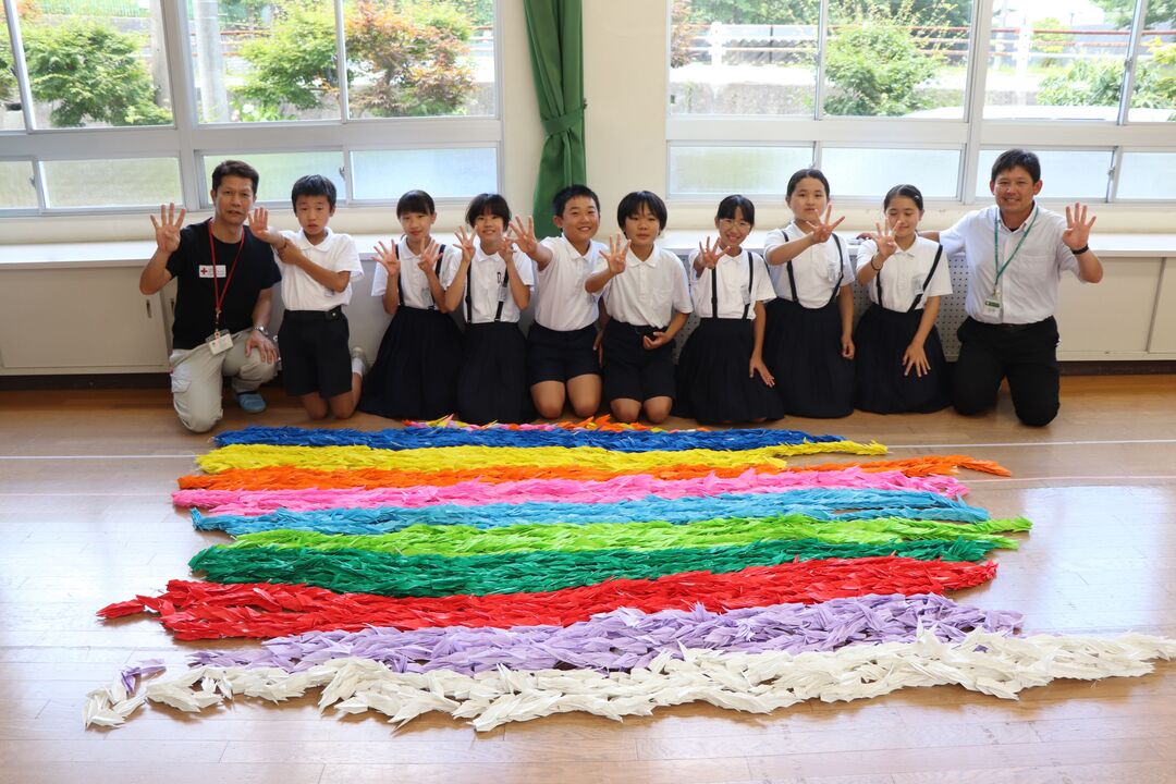 長崎市立山里小の吉本校長(右奥)の話を聞く広島市立幟町小の5、6年生=広島市中区の幟町小で、高山梓撮影