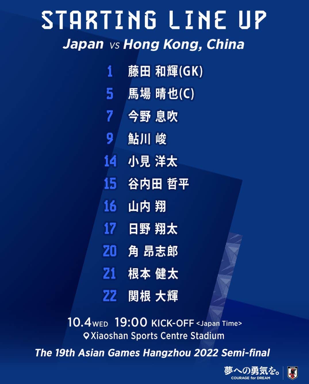 日本サッカー協会さんのインスタグラム写真 - (日本サッカー協会Instagram)「. 🔹U-22日本代表🔹 📝LINE-UP📝 1 #藤田和輝(GK) 5 #馬場晴也(C) 7 #今野息吹 9 #鮎川峻 14 #小見洋太 15 #谷内田哲平 16 #山内翔 17 #日野翔太 20 #角昂志郎 21 #根本健太 22 #関根大輝 𝐒𝐔𝐁🔄 12 #小畑裕馬(GK) 2 #奥田勇斗 3 #吉田真那斗 4 #山﨑大地 6 #松岡大起 8 #重見柾斗 10 #西川潤 11 #松村優太 13 #佐藤恵允 19 #内野航太郎 監督 #大岩剛 🏆第19回アジア競技大会(2022/杭州) ⚔️準決勝 ⌚️19:00(🇯🇵) 🆚ホンコン・チャイナ代表🇭🇰 📺TBS 系列 📱💻#UNEXT 詳しい試合情報はプロフィールのJFA公式サイト『JFA.jp』から✍ #AsianGames #夢への勇気を #U22日本代表 #jfa #daihyo #サッカー日本代表」10月4日 18時30分 - japanfootballassociation