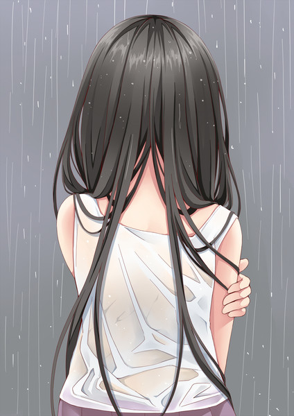 「雨に濡れてワンピースの裾をあげる女性の後ろ姿 | フリー素材のぱくたそ」の写真[モデル:緋真煉]
