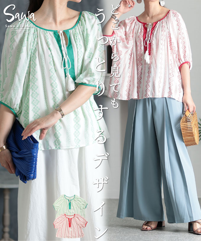 どこから見てもうっとりするデザインブラウス レディース ファッション ブラウス シャツ 総柄 レッド 赤 グリーン 緑 フリンジ紐 五分袖 半端袖 夏 夏服 30代 40代 50代 60代…