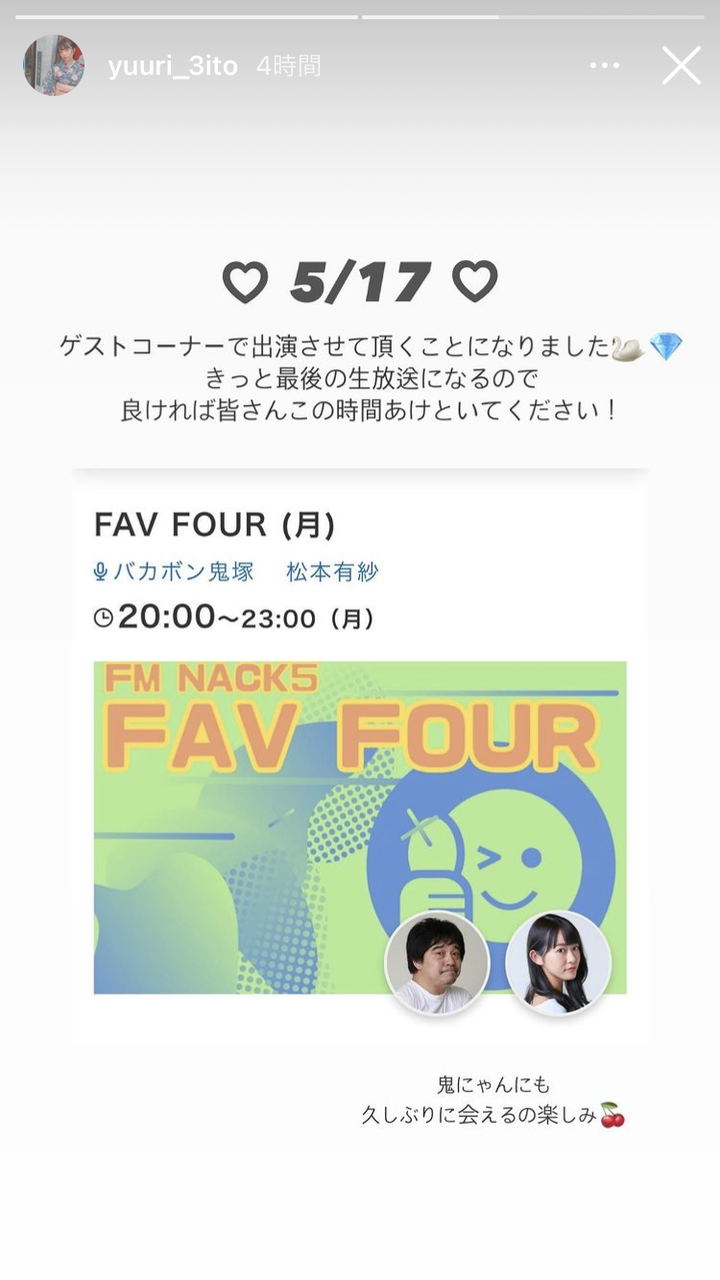 乃木通 乃木坂46櫻坂46日向坂46斉藤優里さんが5/17日に芸能界最後のラジオ生出演する!バカボン鬼塚さんMCの番組だよコメントコメントする view page