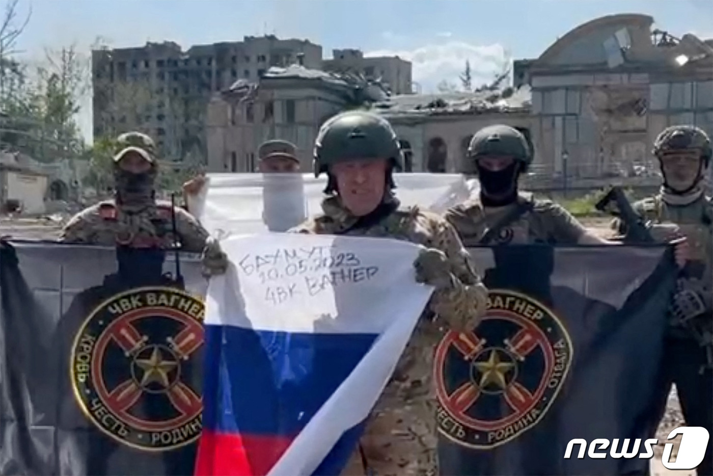 러시아 용병 기업 바그너 그룹의 수장 예브게니 프리고진이 20일(현지시간) 점령을 주장하는 우크라이나 바흐무트에서 바그너 그룹의 깃발을 든 병사들 앞에서 러시아 국기를 들고 있다. ⓒ AFP=뉴스1 ⓒ News1 우동명 기자