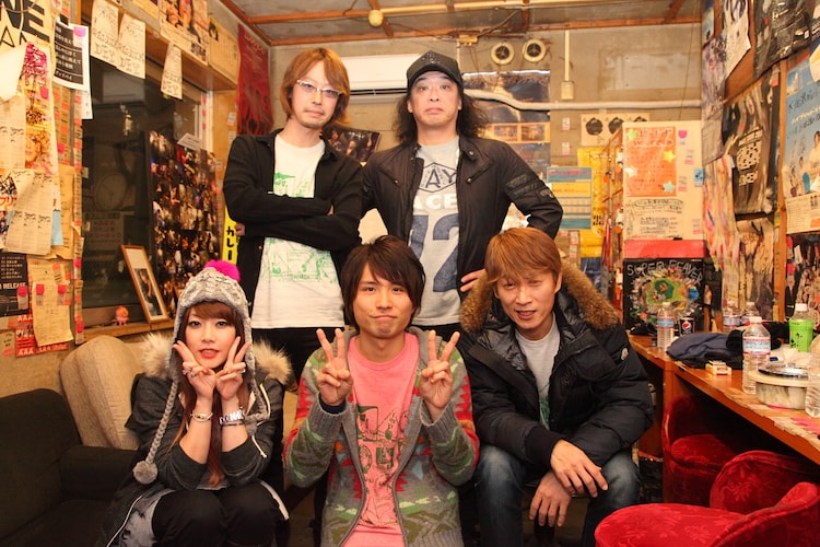 終演後に楽屋で記念撮影。後列左から木下裕晴(B)、手島いさむ(G)、前列左から大貫亜美(G)、フジタユウスケ(Vo, G)、川西幸一(Dr)。