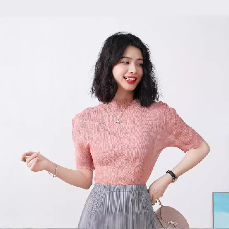 ブラウス レディース 柳条 楊柳 クレープ 半袖 トップス 薄手 シアー シャツ プルオーバー きれいめ 通勤 OL オフィス カジュアル フェミニン かわいい グレー ピンク系