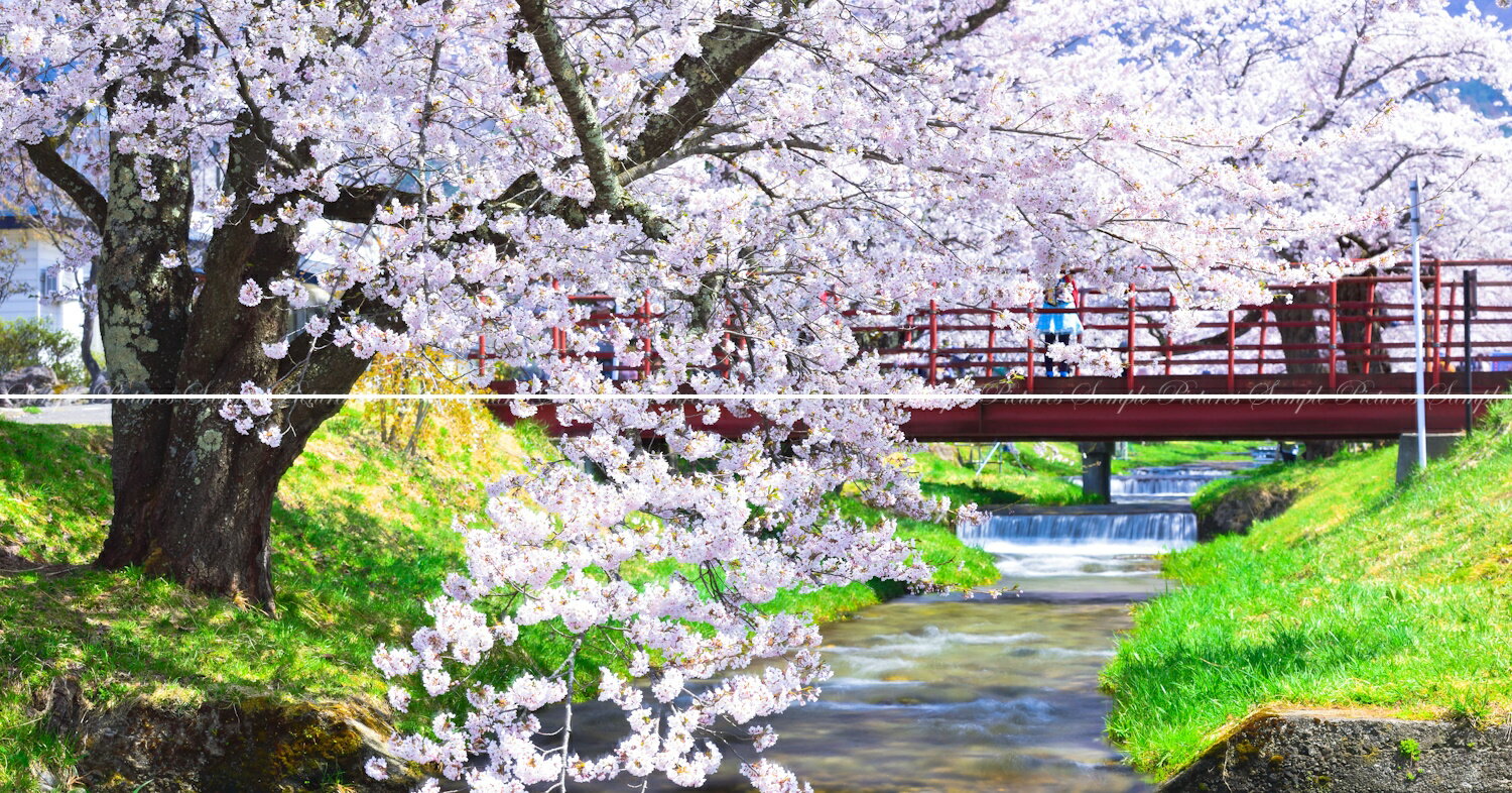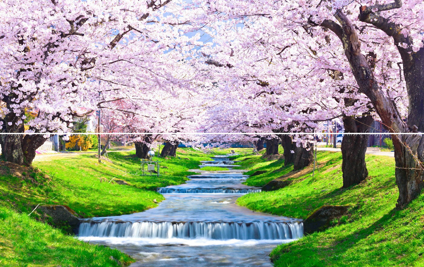 絵画風 壁紙ポスター (はがせるシール式) 【特大上下2枚仕様】-地球の撮り方- 流れ落ちる段々の川と桜の絶景、猪苗代町の観音寺川の桜並木《写真家/糸氏雄一郎》 キャラクロ…